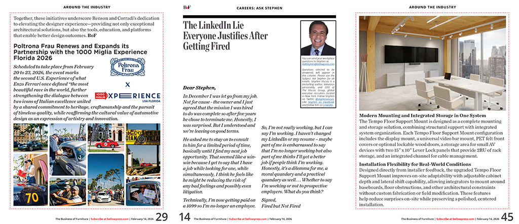 MNLA Elevates Four to Principals, Signaling the Next Chapter in Firm Leadership / Renson North America Promotes Max Sebrechts to Architecture & Design Director / IIDA NY Honors Fifth Annual Hazel Siegel Scholarship Recipients / A-Light Wins Three GOOD DESIGN® Awards / MillerKnoll Recognized as one of the Fortune World's Most Admired Companies 2026 / SouthWorth Capital Management Acquires American Furniture Manufacturing / Corgan Promotes Emily Strain to Lead Workplace Interiors Sector / Premier Promotes Johannes Michalsky to Chief Executive Officer / HOLLY HUNT Introduces New Collection Of Textiles and Wallcoverings for Spring 2026 / The 2026 Carnegie Trend ReportHas Arrived