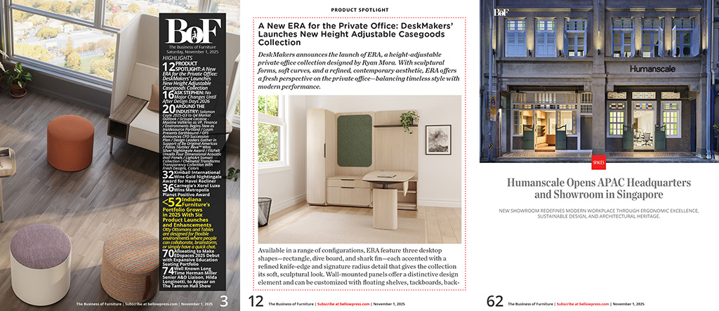 Solomon Coyle 2025-Q3 to Q4 Market Outlook Report Released / Groupe Lacasse Announces Nomination of Maxime Vallières as Vice-President, Finance / Environments Begins Exciting New Chapter as Insidesource Portland / Luum Presents Earthbound, a Chenille Upholstery Textiles Made From Garment Waste / OFS Announces CFO Succession Plan as Part of Strategic Leadership Transition / Knak Group, Heller Furniture, MillerKnoll, and KBM Hogue Unite Northern California Design Leaders in Support of Be Original Americas / Pallas Textiles' Reve™ Collection Wins Silver in the 2025 Nightingale Awards / FilzFelt Unveils Four New Dimensional Acoustic Wall Panels / LightArt Unveils Somari Collection / Chemetal Transforms Transparency Collection With Fresh Designs, Colors