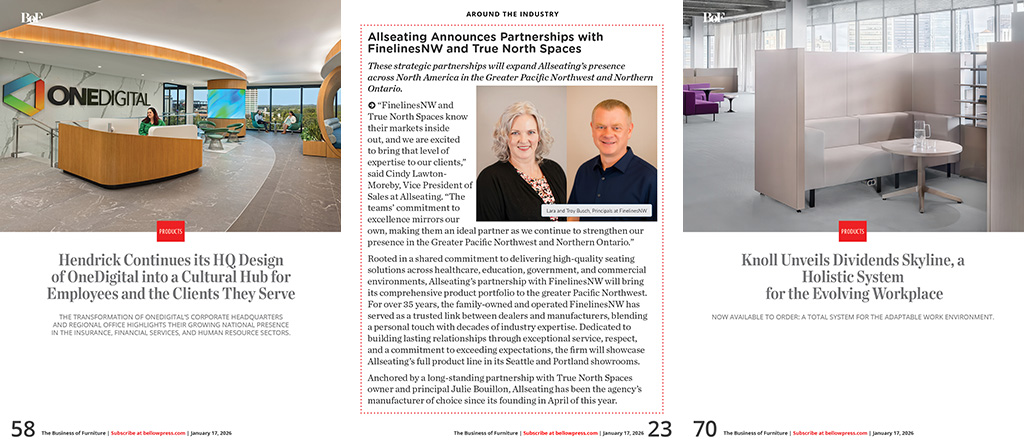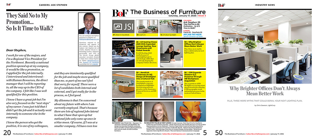 New publications about predicting change, not just watching it / Deb Bailey: Take nothing for granted / Sales' love-hate relationship with technology / Finding Talent Requires Strategy / Stephen Says / Ten "S" (teps) Toward the "OotF" / Losing Control of Your Brand / Stop Poaching my Employees! / Develop Your Most Important Asset: Your People / Ergonomics Faces Future With More Handhelds, Fewer Desks / Sales vs Marketing? The Internet has Changed that Relationship Forever / JRB Studio completes the design circle / In2Design's experience benefits growing customer base / West Elm Workspace takes industry by storm / The future of coworking / National learns from its own new HQ experience / DWR's dynamic duo:Edelman & McPhee / FluidStance is on the Level (and hopes you are too) / Tech startup PointDrive picks furniture close to home / Folkert Goes Big, Goes Bold / Industry Can Learn From The Coworking Movement / AV can add to a Dealer's Bottom Line / Where's Your ShowroomR? Everywhere / Group Dekko: Supplier to Budding Tech Company / Emory University connects with Backbone / HDR Chicago / IDEO has joined the creative kyu collective, a unit of Tokyo-based Hakuhodo DY Holdings / Studio Wise Uses Expertise in Specials to Create New Lines / Reflections on Groupe Lacasse turning 60 from its CEO / MOI Moves to New D.C. NoMa Showroom / idesk, Cherryman make a Splash on Silicon Beach in L.A. / Stir unveils new Product / The Backlash Against Collaboration / Melissa Price Helps Detroit Pop / Artopex showrooms / PWV Takes Carpets to New (Corporate) Levels / Dauphin Retools for the North American Market / History is Important but OM is Ready for the Next 30 Years /
