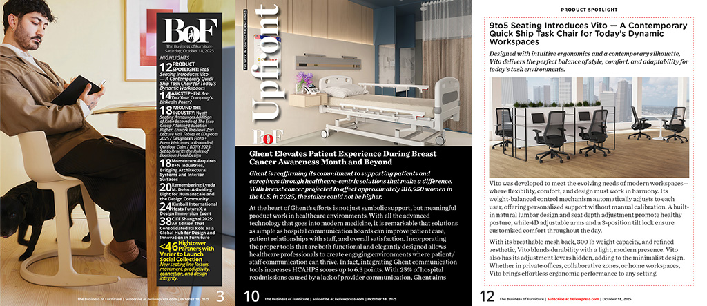 •   PRODUCT SPOTLIGHT: 9to5 Seating Introduces Vito — A Contemporary Quick Ship Task Chair for Today's Dynamic Workspaces - Vito was developed to meet the evolving needs of modern workspaces—where flexibility, comfort, and design must work in harmony. Its weight-balanced control mechanism automatically adjusts to each user, offering personalized support without manual calibration.