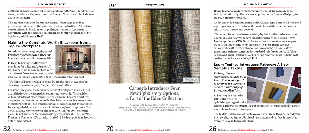 •   AROUND THE INDUSTRY - Design Visionary to Address Design Community at Leaders Breakfast / Concertex Presents Spring 2026 Opus Collection / Meet Colorfall: a High-Performance Velvet Upholstery from Luum Textiles / Colebrook Bosson Saunders Highlights New Opportunities for Leadership to Drive Performance in Hybrid Environments / Jamie Stern Furniture, Carpet, Leather & Fabric Introduces the Interlock Collection / Tarkett Debuts iQ Motion: Terrazzo-Inspired "Workhorse" Flooring, Designed to Be Restored + Circular