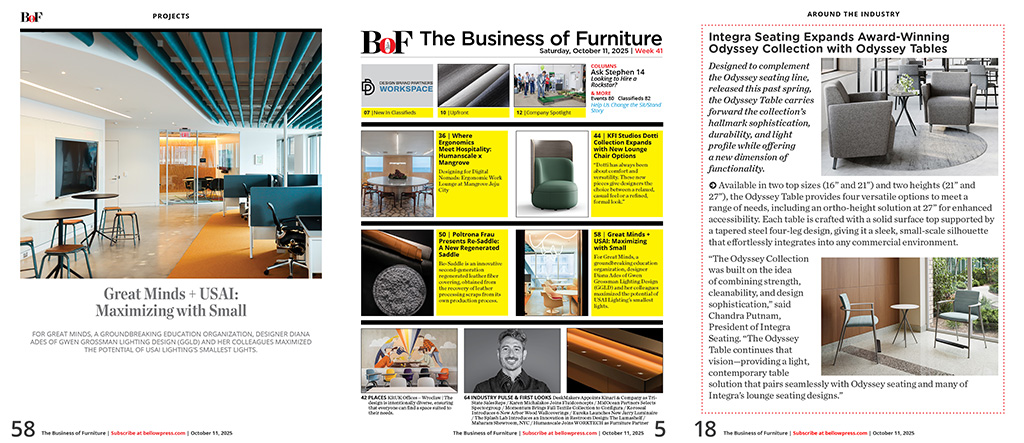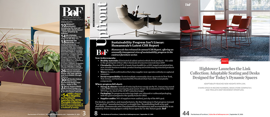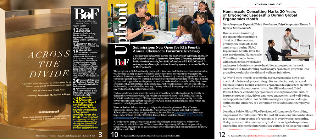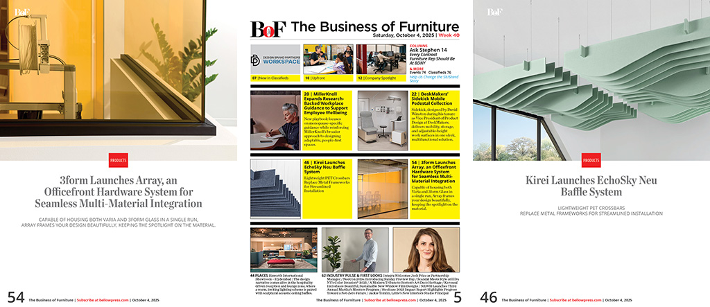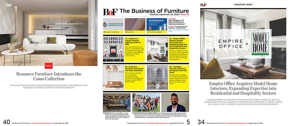 New publications about predicting change, not just watching it / Deb Bailey: Take nothing for granted / Sales' love-hate relationship with technology / Finding Talent Requires Strategy / Stephen Says / Ten "S" (teps) Toward the "OotF" / Losing Control of Your Brand / Stop Poaching my Employees! / Develop Your Most Important Asset: Your People / Ergonomics Faces Future With More Handhelds, Fewer Desks / Sales vs Marketing? The Internet has Changed that Relationship Forever / JRB Studio completes the design circle / In2Design's experience benefits growing customer base / West Elm Workspace takes industry by storm / The future of coworking / National learns from its own new HQ experience / DWR's dynamic duo:Edelman & McPhee / FluidStance is on the Level (and hopes you are too) / Tech startup PointDrive picks furniture close to home / Folkert Goes Big, Goes Bold / Industry Can Learn From The Coworking Movement / AV can add to a Dealer's Bottom Line / Where's Your ShowroomR? Everywhere / Group Dekko: Supplier to Budding Tech Company / Emory University connects with Backbone / HDR Chicago / IDEO has joined the creative kyu collective, a unit of Tokyo-based Hakuhodo DY Holdings / Studio Wise Uses Expertise in Specials to Create New Lines / Reflections on Groupe Lacasse turning 60 from its CEO / MOI Moves to New D.C. NoMa Showroom / idesk, Cherryman make a Splash on Silicon Beach in L.A. / Stir unveils new Product / The Backlash Against Collaboration / Melissa Price Helps Detroit Pop / Artopex showrooms / PWV Takes Carpets to New (Corporate) Levels / Dauphin Retools for the North American Market / History is Important but OM is Ready for the Next 30 Years /